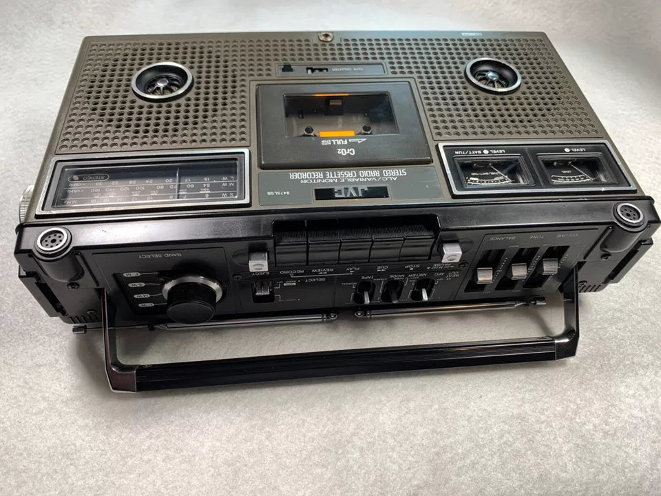 JVC Vintage Radio Cassette Recorder with 4 Band Radio. A very clean and great sounding example of this rare model, which has just been serviced for sale. The frequency response is excellent for a 2 speaker unit, with a full sound and clear trebles, due to the original dual cone speakers. Nearly 50 years old, but looks, performs and sounds fabulous!