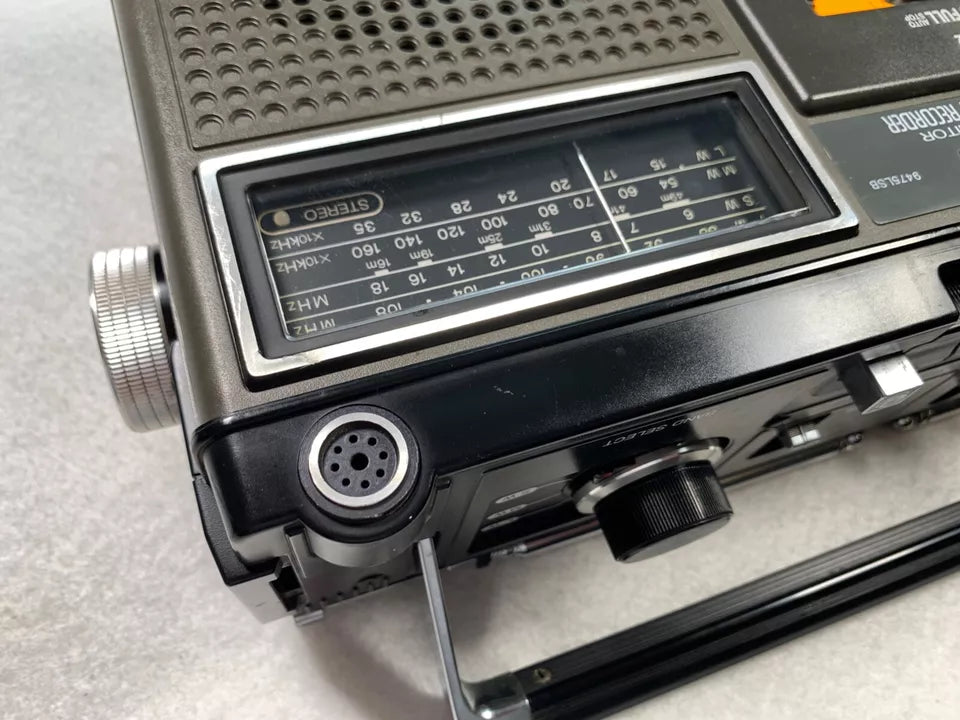 A lovely portable boombox from the 1970's for the office, home, or simply for decoration, with the benefit of being serviced. The tape mechanism works perfectly in all directions, and the radio is clear. The balance control sweeps properly from left to right, and the tone control affects the sound well.