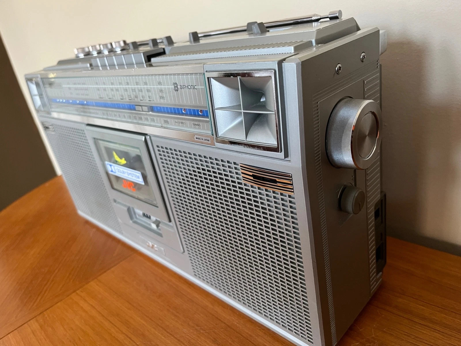 A lovely portable boombox from the 1980's for the office, home, or simply for decoration, with the benefit of being serviced. The tape mechanism works perfectly in all directions, and the radio is clear. The aerials are original and complete with no missing tips.