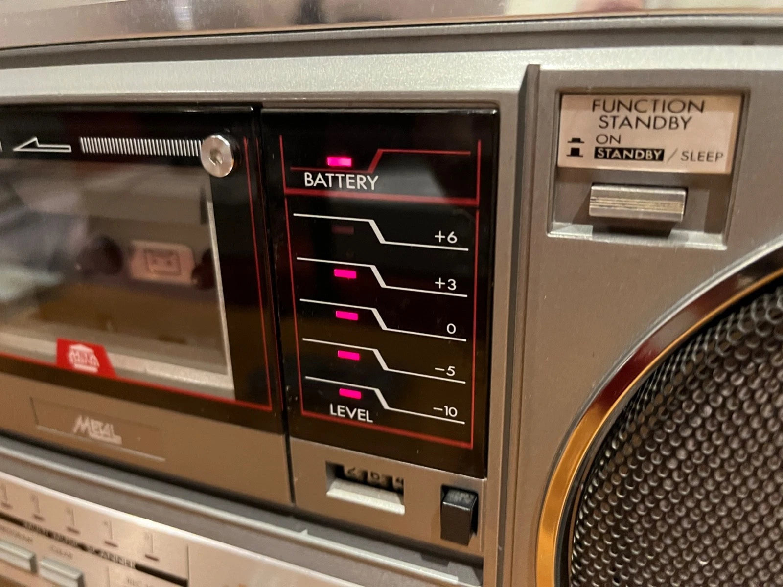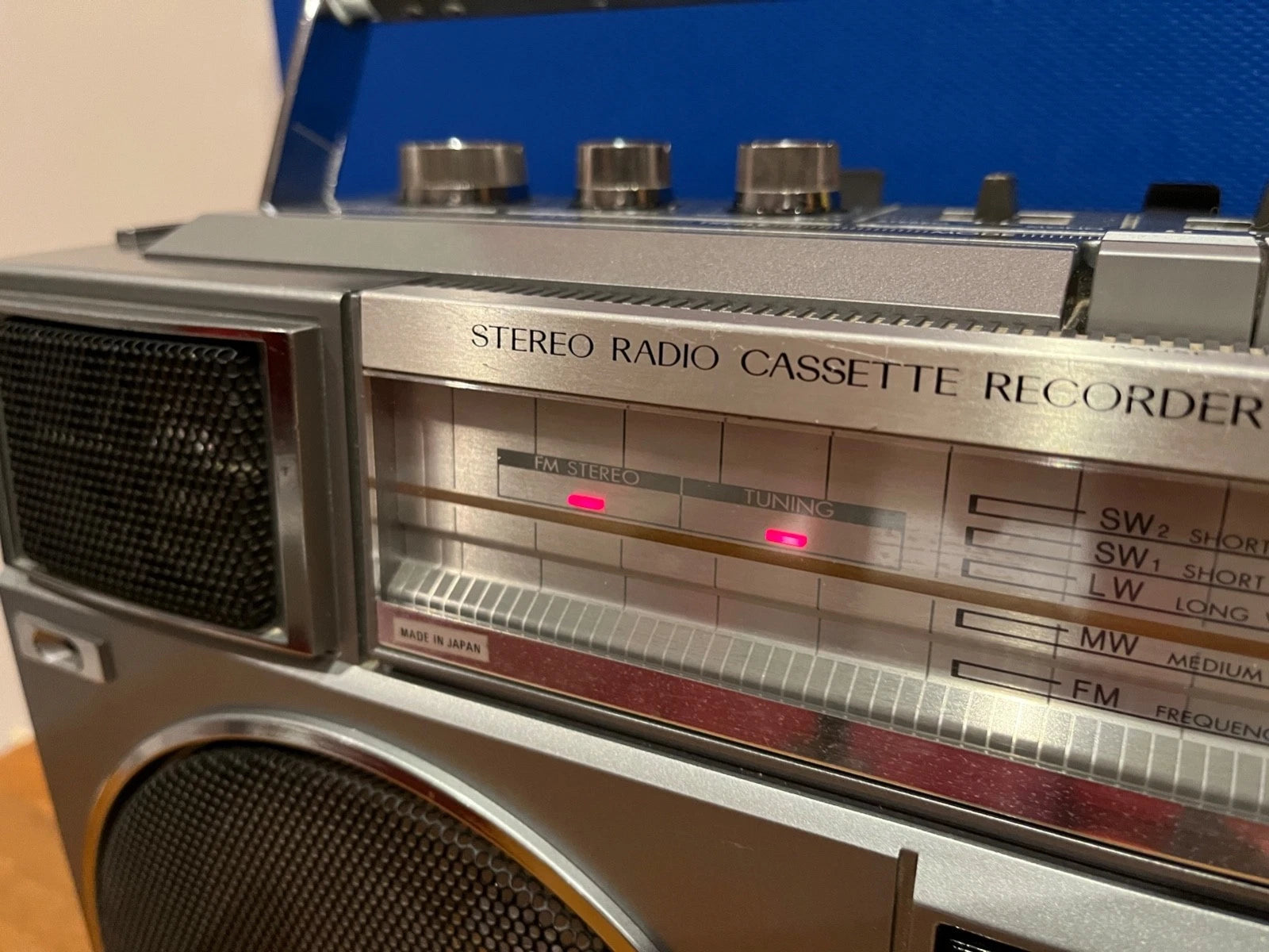 A lovely portable boombox from the 1980's for the office, home, or simply for decoration, with the benefit of being serviced. The tape mechanism works perfectly in all directions, and the radio is clear. All controls work perfectly with no crackle.