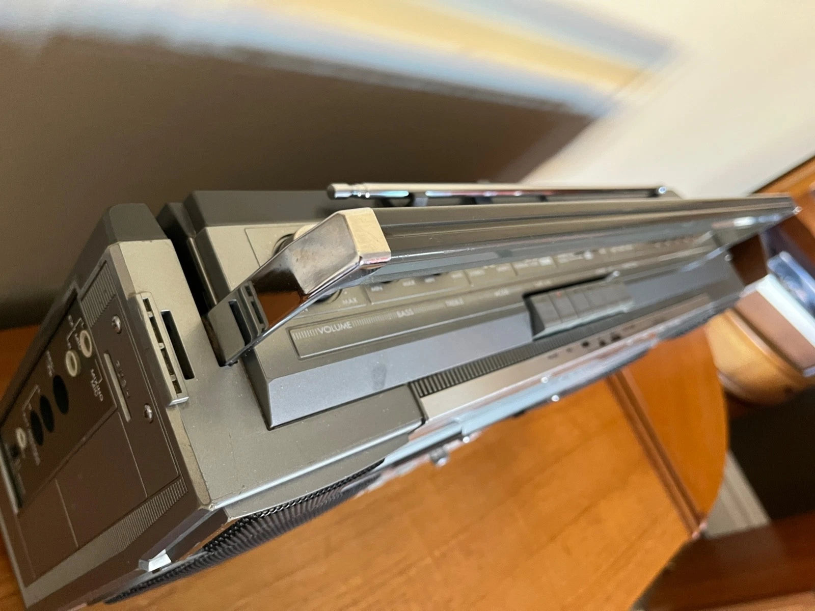 A lovely portable boombox from the 1980's for the office, home, or simply for decoration, with the benefit of being serviced. The tape mechanism works perfectly in all directions, and the radio is clear. All controls work perfectly with no crackle.