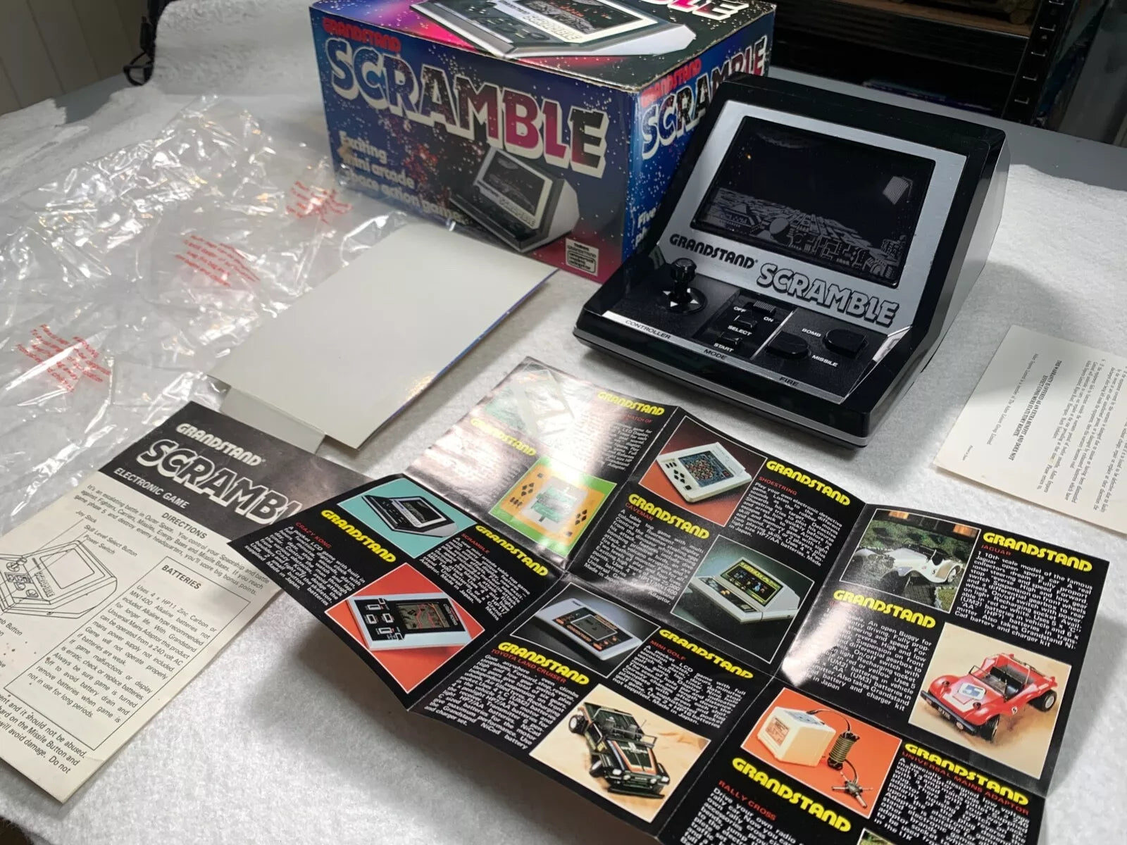 Scramble Grandstand VFD Tabletop Game in Gorgeous and Full Working Condition. Complete with excellent box, card screen protector, warranty slip, instructions and promo booklet and the extremely rare original bag!