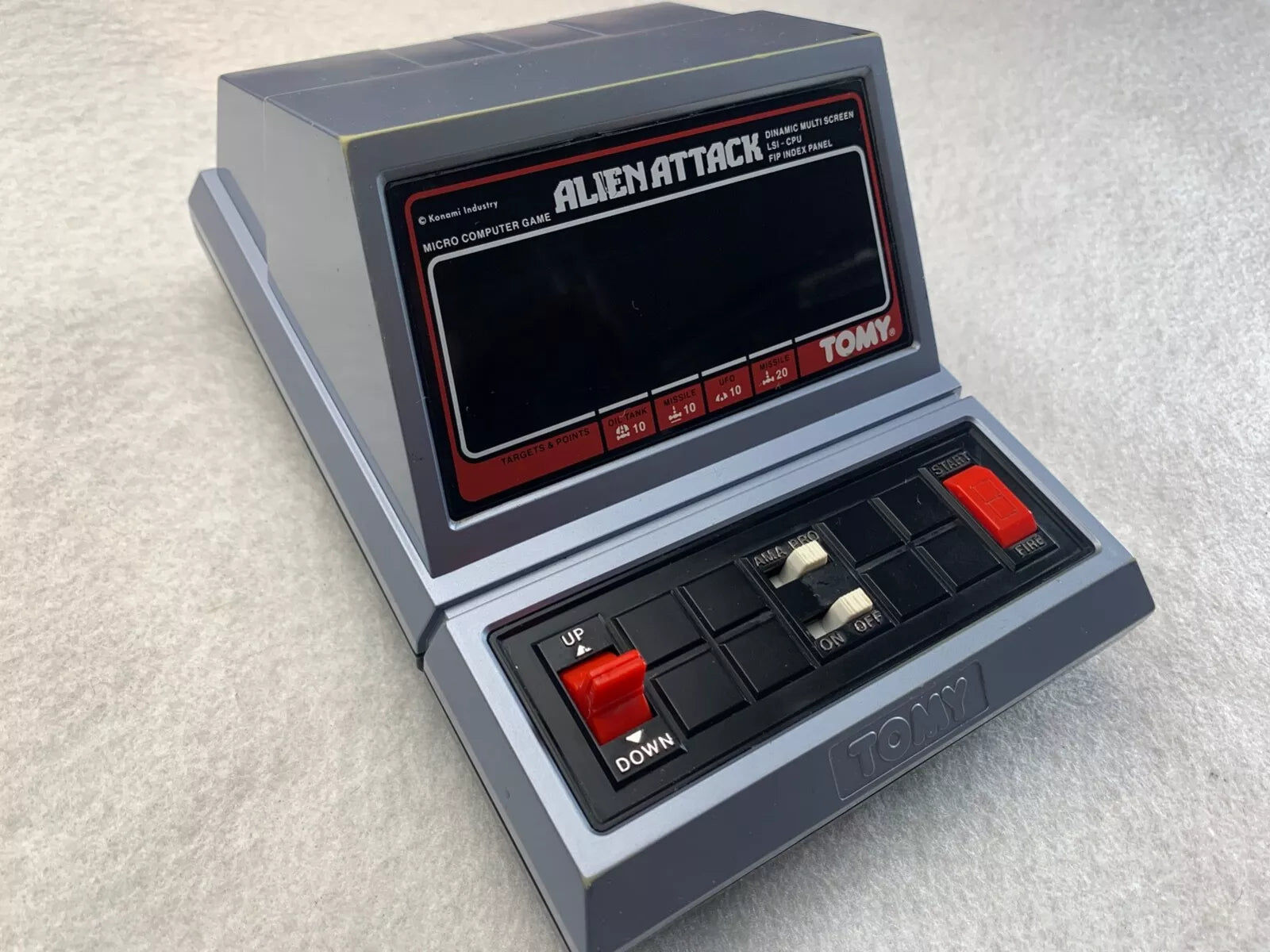 Here we have a super cool Alien Attack game from Tomy. It is in full working condition, and has just been stripped and cleaned - including a service of the switches, contact pads etc. All controls work properly. The speaker is loud & clear, and the VFD display is bright.